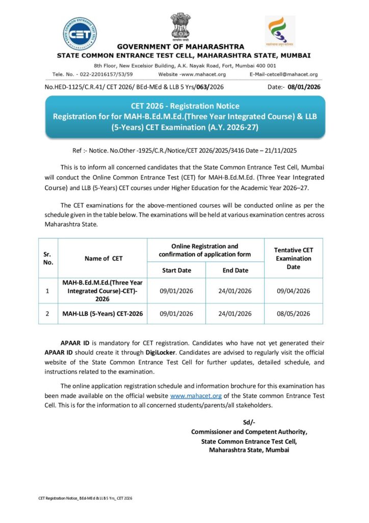 This is to inform all concerned candidates that the State Common Entrance Test Cell, Mumbai will conduct the Online Common Entrance Test (CET) for MAH-B.Ed.M.Ed. (Three Year Integrated Course) under Higher Education for the Academic Year 2026-27.