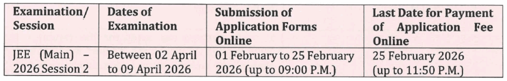 A schedule for the conduct of JEE (Main) – 2026 is given below for information of all JEE aspirants: