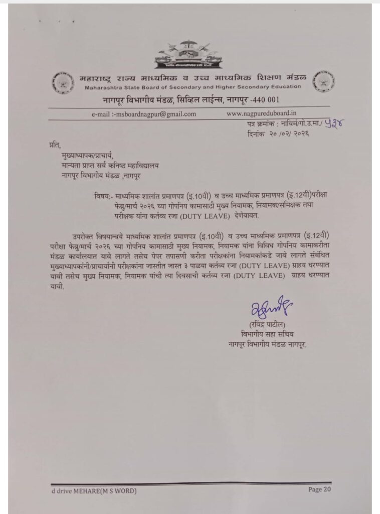 माध्यमिक शालांत प्रमाणपत्र (इ.10 वी) व उच्च मार्थ्यामक प्रमाणपत्र (इ.12वी) परीक्षा फेब्रु/मार्च २०२६ च्या गोपनिय कामासाठी मुख्य नियामक, नियामक समिक्षक तथा परीक्षक यांना कर्तव्य रजा (DUTY LEAVE) देणेबाबत..…