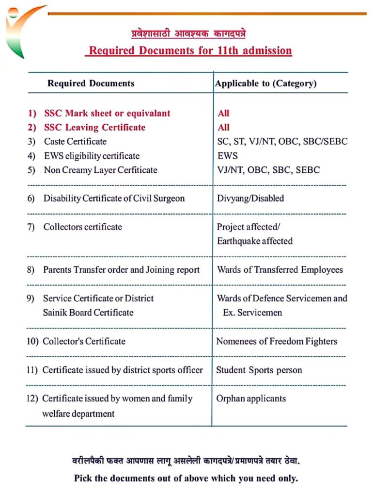 टीप:- उपरोक्त कागदपत्रे इयत्ता 11 वी ऑनलाईन प्रवेश प्रक्रीयेसाठी आवश्यक आहेत.