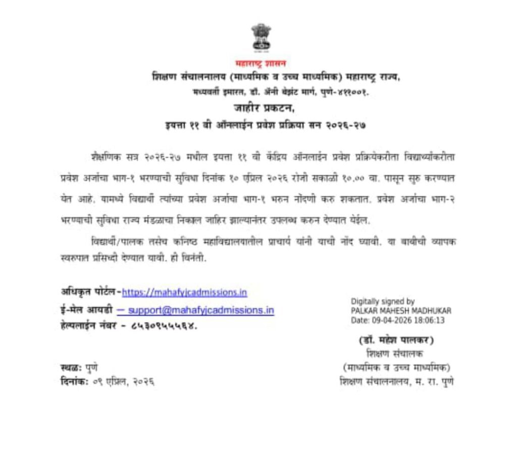From the academic year 2026-2027, admission to Std 11 in all recognized higher secondary schools/junior colleges in the state of Maharashtra will be done through the central online admission system.