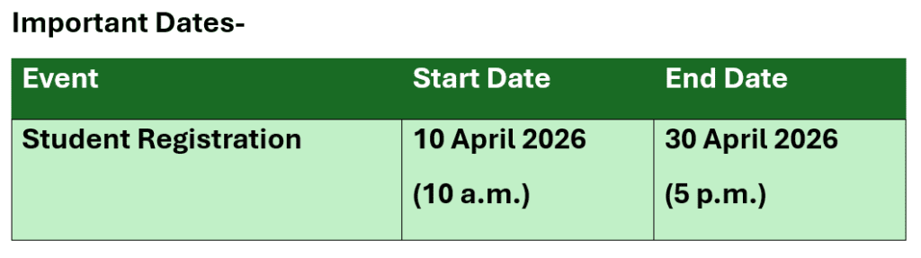 विद्यार्थी नोंदणी प्रक्रिया १० एप्रिल रोजी सकाळी १०:०० वाजता सुरू होईल आणि ३० एप्रिल रोजी सायंकाळी ५:०० वाजता संपेल. नोंदणीसाठी खालील बाबी आवश्यक आहेत.